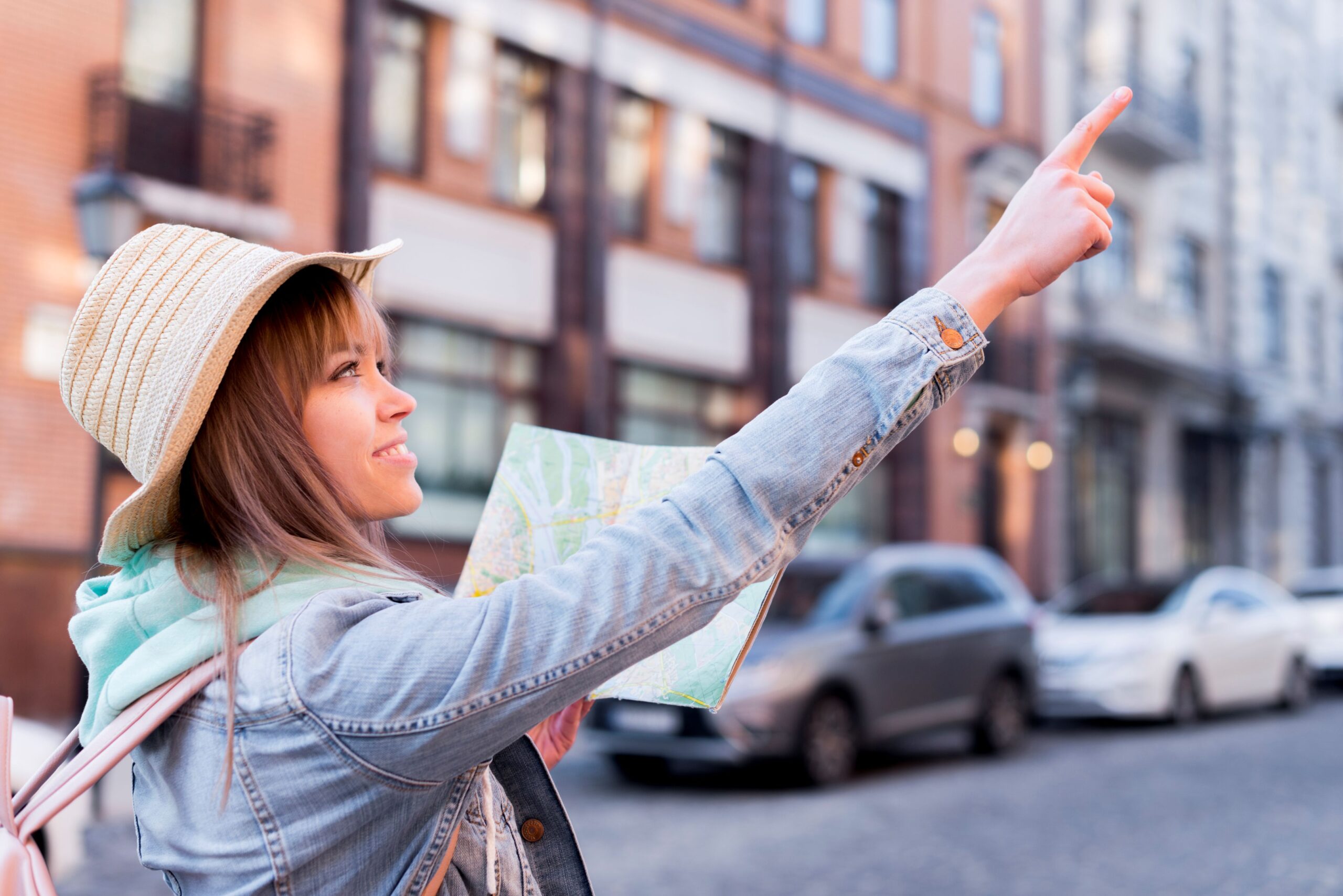 happy-female-traveler-holding-map-hand-pointing-something-city